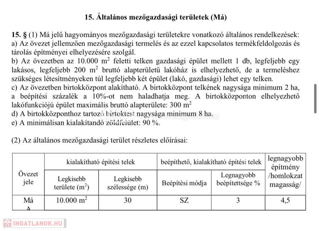 A Tulajdonos tájékoztatása szerint, övezeti besorolása: Má, azaz általános mezőgazdasági terület. A képek között szerepel az övezeti besorolás jellemzői (tájékoztató jelleggel, változhat). Az ingatlant érinti a földtörvény, így vásárláskor ki kell függeszteni.