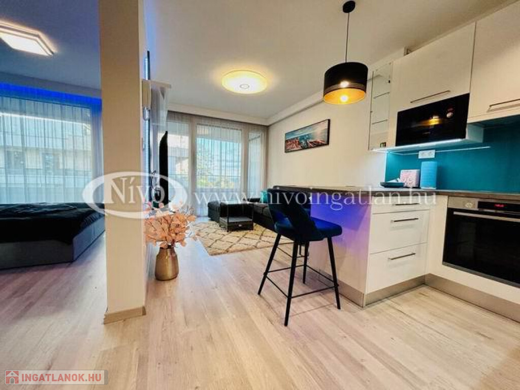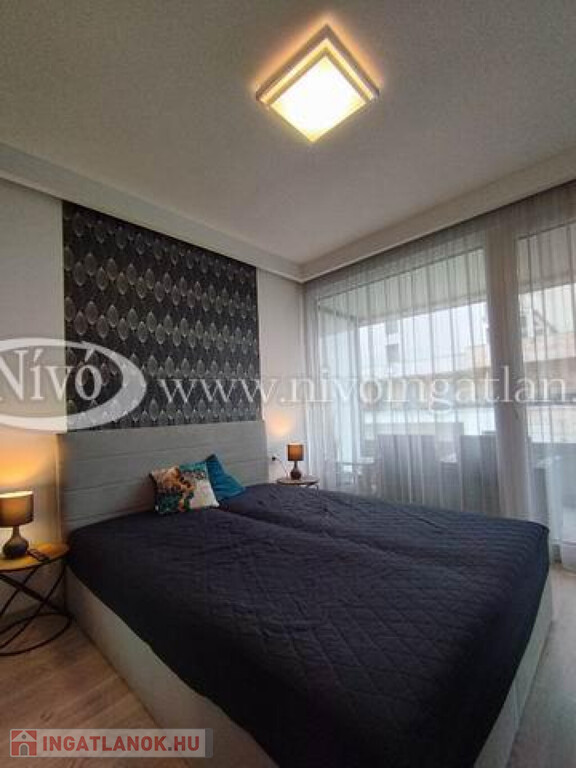 Alsóörsön, partközeli, Balatoni-rálátással, igényes, exkluzív, medencés, 2022-ben épült liftes társasházban, tégla lakás nagy méretű terasszal és teljes, komplett berendezéssel eladó.